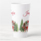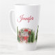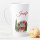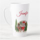 Une tasse en latte avec un thème de Noël mignon et fantaisiste. Une caravane cosy décorée pour Noël entre quelques pins. Personnalisez avec un nom ou un autre texte.