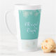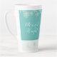 Grosse tasse en latte pour la saison des fêtes. Coup de flocons de neige et une jolie illustration de bonhomme de neige sur couleur vert turquoise avec votre choix de dire. "Joyeux et heureux" est l'exemple de texte.