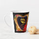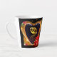 Belle tasse en latte avec une image imprimée d'une peinture acrylique de deux anneaux mariages en or à l'intérieur d'un coeur en forme d'or avec une rose rouge.