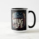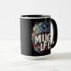 Diese Kaffee-Tasse mit dem Text "Tasse Life" in einem beeindruckenden Street-Art-Schriftart besticht durch einen kühlen, graffiti-artigen urbanen Hintergrund. Das Design verkörpert einen strapazierfähigen Look, komplett mit einer Bandana und Farbtönen, die das Wesen des "Durchzugslebens" einfangen.