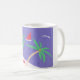Diese klassische weiße Tasse ist mit Palmen, Sonnenschirmen, blauem Wasser und einem roten Segelboot ausgestattet.