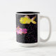 Niedliche Tasse mit bunten und komischen Fischen auf schwarz gepunktetem Hintergrund. Der Name auf der Tasse kann geändert oder entfernt werden. Dank Creative Fabrica für einige der Elemente in der Gestaltung.