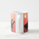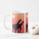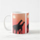 Diese klassische weiße Tasse wurde mit meiner Darstellung von Giraffen entworfen, die von einem orangefarbenen Sonnenuntergang silhoutiert wurden.