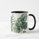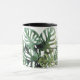Diese stilvolle tropische Tasse besticht durch einen schlichten, weißen Körper mit schwarzem Griff, Interieur und Felge. Sie zeigt ein lebendiges Muster üppiger, grüner Monstera-Blätter. Fügt dem Alltag eine Touch tropischer Eleganz hinzu.