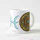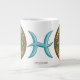 Dieses Fisces themed mandala verfügt über einen Aquamarinstein, umgeben von dem Symbol für das Zeichen, die Konstellation, und das alchemistische Symbol für Wasser zwischen Filigree und Weber. Diese Tasse ist in Jumbo, Espresso, Knochen-China und Styles erhältlich.