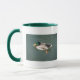 Eine Ente, die sich auf dem dunklen Wasser treiben und den orangen Locker Fuss in Wasser hängen lässt ist auf dieser Tasse zu sehen. Texte dans der Mitte : prenez un peu de repos. Mach mal Pause, danach arbeitet homme sorcier besser.