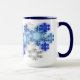 3D Schneeflocken in dunkler und heller Blues, weiß und grau, schmücken diese Tasse.
