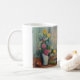 Malerei eines Vase Blumen und anderer Einzelteile auf einer Tischplatte vor einem Fenster