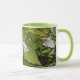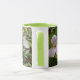 DREILIUMBLUMEN UND HELLE GRÜNE FOLIAGE UMGEBEN DIESE KAFFEE TASSE. TRILLIUM IST EINE DER FRÜHEN FRÜHSTÜCKSBLUMEN, DIE OFT AUF WOLDFLÄCHEN GESEHEN WERDEN. EINE SCHÖNE GESCHENKIDEE FÜR MUTTER.