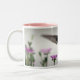 Blume und ein Kolibri erstrecken sich um eine zweifarbige Tasse.