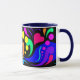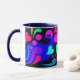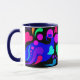 Le premier de 4 tasses avec les poignées et les intérieurs colorés. La conception sur celle-ci a des coeurs, des bulles et des remous dans des couleurs audacieuses et jolies sur un panneau noir. La poignée et l'intérieur sont bleu marine.