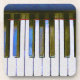 Study in Blue - Die originelle Illustration von ZoeSPEAK auf diesem Untersetzer ist eine Nahaufnahme einer Klaviertastatur, mit einem blauen Highlight auf den dunklen Klaviertasten und Reflexionen der Tasten im dunkelbraunen Holz auf der Rückseite. Eine dünne Linie mit weichem Rot trennt das Holz von den Tasten.