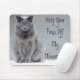 Behalten Sie den grauen Kitty glücklich! "Behalten Sie Ihre Tatzen weg von meinem Mousepad!" nahe bei einer verärgerten schauenden grauen Miezekatze. Macht ein großes Geschenk - für jede mögliche Gelegenheit.