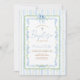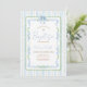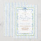 Diese Einladung zeigt wasserfarbene blaue Blumen, grüne Blätter, eine zarte Schleife und klassische Kreuz-Akzente, alle umrahmt von Salbei- und blauen Streifen für einen frischen, zeitlosen Look.