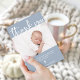 Diese einfache und stilvolle Taufkarte mit einem Foto Ihres Babys mit modernster Schriftzeichen-Typografie und einem passenden Kreuz auf weichem blauem Hintergrund.