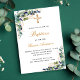 Weiß, mit Eukalyptusgrün, goldenen Blätter und einem goldenen Kreuz dekoriert. Personalisieren und die Kinder Name und Zeremonie Details. Schwarze und goldfarbene Buchstaben. Zurück: hellblaue Hintergrundfarbe.