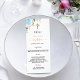 Taufe Empfang Menükarte. Personalisieren und fügen Sie einen Namen, Datum und das Menü. Ein schick weißer Hintergrund. Dekoriert mit einer wasserfarbenen, hellblauen Rose und grünen Eukalyptus-Blätter, Sprigs, Grün, Imitat goldenen Blätter. Ein Imitat vergoldet. In unserem Shop sind passende Servietten erhältlich!