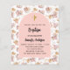 Ein Bogen auf einem Muster aus Pampasgras und rosa Blume und einem goldenen Kreuz. Personalisieren und fügen Sie einen Namen und Details. 1 Blatt = 1 Einladung mit Druckkante bis Kante.