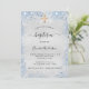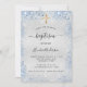 Eine moderne, elegante Taufe, die einen kleinen Jungen feiert. Imitat silber aussehender Hintergrund mit blauen Imitaten Glitzer Staub und ein goldenes Kreuz. Personalisieren und fügen Sie einen Namen und Party-Details hinzu. Schwarze Buchstaben.