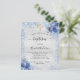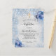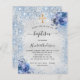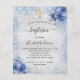 Eine moderne, elegante Taufe, die einen kleinen Jungen feiert. Imitat silber aussehender Hintergrund mit blauen Imitaten Glitzer und Blumen. Ein goldenes Kreuz. Personalisieren und fügen Sie einen Namen und Party-Details hinzu. Schwarze Buchstaben.