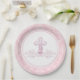 Teller aus Taufpapier mit hübsch rosa Perlenschwirl kreuzen auf einem rosa Damast-Hintergrund. Diese eleganten, rosa Taufpapier-Teller lassen sich einfach durch einfaches Hinzufügen von Texten anpassen. Sie können das Kreuz auch nach Bedarf auf diesen rosa Damastettismus, Taufe und ersten kommunion paper Tellern bewegen.