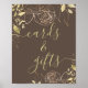Dieses Plakatdesign besticht durch goldene Pfannkuchen und Blattwerk in einem modernen, minimalen zeichn-Stil auf solidem Hintergrund. "Karten & Geschenke" im passenden Schriftart mit einer handgeschriebenen kursiven Typografie. Dieses Schild ist der perfekte Weg, um Hochzeitsgäste lassen oder zu duschen wissen, wo sie ihre Geschenke verlassen haben.