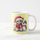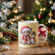 Taza navideña de cerámica con un dulce diseño de osito con gorro de Papá Noel acompañado de un simpático muñeco de nieve. Su fondo en tono suave resalta la ilustración, creando un estilo tierno y acogedor. Ideal para disfrutar bebidas calientes en invierno o como regalo especial en estas fiestas.