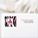 Ein Rücksendelabel für Lehrer, das eine Abbildung des Pink Schoolhouse Logos auf einem Zebra-Hintergrund mit rosa Zierleisten verlasse. Personalisieren Sie mit Ihrem Namen und Ihrer Adresse auf der rechten Seite.