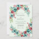 This design features a lush arrangement of watercolor teal anemones and deep pink roses. Soft sage green eucalyptus leaves and delicate sprigs create a whimsical and romantic aesthetic. The ethereal palette of turquoise, berry, and mint green evokes the freshness of a meadow in full bloom. It captures a painterly and artistic atmosphere perfect for a seasonal outdoor event.