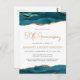 This elegant 50th anniversary party invitation features a top and bottom border of watercolor agate geode in shades of teal blue with faux gold glitter highlights. The words "50th Anniversary" appear in sparkly gold faux foil in decorative modern handwriting font. Customize it with the names of the guests of honor in gold-colored text and the party details in charcoal gray on a white background.