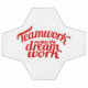 Grafischer roter Text. Der rote Slogan lautet wie folgt: Teamwork macht den Traum funktionieren. Ideal, um Teamwork inspirieren oder für Gebäude-Events im Team. Einzigartig gestaltet von Sarah Trett.
