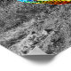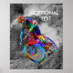 Super intensive Farben in einem abstrakten edgy Stil eines Radfahrers, der auf einem Mountainbike einen schmutzigen Pfad hinuntergeht. Die Hauptfigur ist mehrfarbig; der Hintergrund ist ein Schwarz-Weiß-Foto von Staub, der auf dem Weg auftaucht