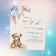 Für eine moderne Babydusche im bohischen Stil. Ein beige Hintergrund. Die Einrichtung besteht aus einer staubblauen Rose, Pampas-Gras und einem Teddybär. Personalisieren und fügen Sie einen Namen und Party-Details hinzu. 1 Blatt = 1 Einladung mit Druckkante bis Kante.