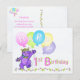 Eine lila Teddybär-Prinzessin, gekleidet in einer hübschen, gelben, juwelenbesetzten Krone und rosa, blaue und grüne Blume tanzt durch die Blume und hält einen Haufen farbenfroher Ballons mit dem Wort GLÜCKLICH auf ihnen. Diese Geburtstagskarte bringt ein Lächeln auf ein spezielles Mädchen zu ihrem 1. Geburtstag. Personalisieren Sie mit ihrem Namen, um es besonders zu machen. Originelles Design von Anura Design Studio.