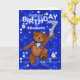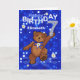 Niedlicher kleiner brauner Teddybär mit blauem Bogen, der durch blaue Lichter und Gänsebläschen tanzt und eine glänzende Figur wie Nr. 7 hält, ist ein lustiger 7. Geburtstagsgruß für dieses kleine Mädchen in deinem Leben mit ihrem Namen auf der Kartenvorderseite. Personalisieren Sie den Namen auf der Vorderseite und im inneren Vers mit den angegebenen Vorlagen. Originelles Design von Anura Design Studio.