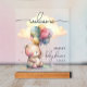 Ein niedlicher, kuscheliger Teddybär, ein Haufen Ballons, Schmetterlinge, flauschige Wolken und Ihre Details, zusammen mit dem Wort "Willkommen" oben auf diesem klaren Acrylzeichen. ÄNDERN SIE DIE GRÖSSE, um Ihre Veranstaltung und Bestellung mit oder ohne Holzständer. PASSENDE Artikel in unserer Sammlung.