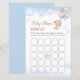A sweet baby shower bingo game card featuring an adorable teddy bear holding soft blue and blush balloons with dreamy cloud and star accents. The gentle watercolor design adds a charming touch to your party activities while coordinating beautifully with matching teddy bear shower decor. Perfect for a boy baby shower, pastel celebration, or bear-themed party game table.