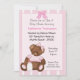 Niedlicher Teddybär mit Milchflasche, rosa Bug und Shirt auf rosa Streifen Hintergrund. Passen Sie Ihre Party an.