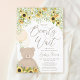 Ein niedlicher Sonnenblumenstrandlehrer trägt eine Babydusche-Einladung. Das Design umfasst gelbe Sonnenblumen und Grünpflanzen in Aquarelltönen, mit Ballons und einer Teddybär-Illustration. Ideal für eine geschlechtsneutrale Babydusche. Auch funktioniert großartige sommerliche Babydusche für Junge oder Mädchen.