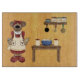Whimsical Teddy Bär gekleidet in einem roten Kleid mit einem gepanzerten weißen Kragen, passend zum Bündchen und einer weißen Schürze mit Herzen auf den Taschen. Sie steht neben ihrem Backtisch, mit einer Schüssel und einigen Zutatenkanistern. An der Wand hängt ein Regal mit Kanistern und verschiedenen Utensilien, die vom Regal hängen. Hintergrund ist ein Holzkornlook.