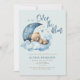Wir sind Over the Moon Baby Shower Einladung mit niedlichen Teddybären schlafen auf puffblauer Wolke und der Halbmond Mond und Sterne. Sweet Junge Dusche Einladung.