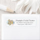 Weihnachts-Rücksendelabel mit einer Weihnachtsszene aus Geschenken und Spielzeug - ein Teddybär, Flugzeug und Bonbons warten neben Geschenken gewartet, um entpackt zu werden. Blauer Rand. Personalisieren Sie mit Ihrem Namen und Ihrer Adresse. Passende Weihnachtskarte verfügbar.