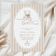 This charming neutral teddy bear baby shower invitation features a soft striped background, an elegant oval arch frame, and a hand-drawn teddy bear illustration.