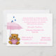 Süßes Baby besprühen Duscheneinladung. Cartoongraphiken eines braunen Teddybären, in den rosa Gesamten und im Halten eines rosa Regenschirmes, verziert die untere links Seite dieser weißen Einladung. Grafiken von drei Regentropfen fallen auf den Regenschirm. Text im Rosa ist bereit, für Ihr Babypartyereignis zu personifizieren. Reizende Einladung, welche die Mamma zum zu sein für überhaupt rettet, mit den Andenken ihres neuen Babys.