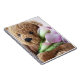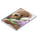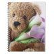 Foto eines traurigen Teddybären mit einer Armaddel aus rosa Calla-Lilien, um mit Ihrem eigenen Text zu personalisieren