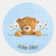 Niedlicher brauner Teddybär und weiße, bläuliche Blume auf blauem und weißem Gingham-Hintergrund.