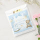 Ein Geburtstagsbild mit blauem Hintergrund, mit einem Bären mit blauem Bogen um den Hals, einem weißen, rockigen Pferd mit blauen Punkten, blauen und beigen Ballons