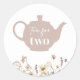 Ein rosa Teekanne mit "Tee für zwei"-Typografie im Inneren, mit zarter Aquarellmalung von Wildblumen am Boden. Ideal für Ihr zweites Geburtstagstee-Party!