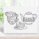 Ein Stapel verzierter Teetassen neben einem hübsch dekorierten Teekessel. Ein Stück Kuchen auf einem Teller vervollständigt dieses Set. Zur einfachen Färbung.