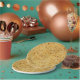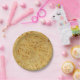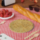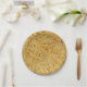 Papierplatte mit Foto von Teigwaren auf Platte.